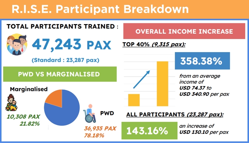Originally piloted in Malaysia in 2014, the R.I.S.E. programme, together with its programme partner People Systems Consultancy (PSC), has transformed the lives of more than 45,000 participants across six countries in the ASEAN region, including Indonesia, Philippines, Laos, Cambodia, and Singapore.